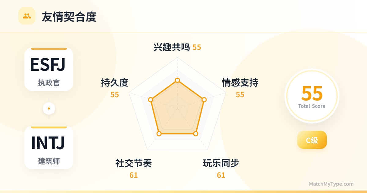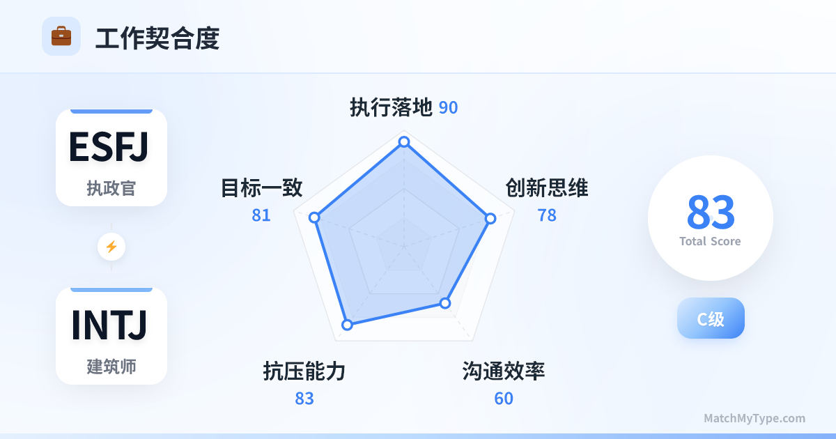 相比于恋爱,你们在职场上其实是一对“王炸”组合。ESFJ 是完美的执行者和团队润滑剂,INTJ 是完美的战略家和系统架构师。只要互不干涉专业领域,你们能建立起坚不可摧的商业帝国。
