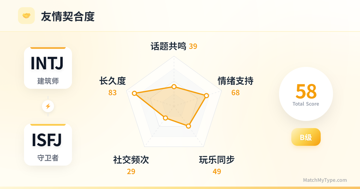 你们通常不会混同一个圈子。INTJ 喜欢智性交流的小圈子,ISFJ 喜欢温馨热闹的熟人局。只有在特定的共同爱好(如阅读、烹饪、或某项具体技能)下,你们才能建立深厚的友谊。