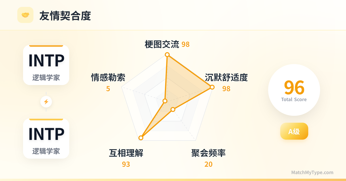 这是完全同频的共振: **Ti (内倾思考) x Ti (内倾思考)**:两个追求真理的逻辑机器。你们的对话像是一场精密的学术研讨会,会不断修正对方的定义和逻辑漏洞。只要双方都保持客观,这将是极其愉悦的智力按摩;但如果一方陷入固执,就会变成无休止的辩论赛。 **Ne (外倾直觉) x Ne (外倾直觉)**:脑洞倍增器。一个 INTP 抛出一个荒谬的假设,另一个不仅不反驳,反而会在这个假设上盖出一座空中楼阁。你们在一起可以花一整晚讨论“如果人类没有大拇指,文明会如何演变”,这种乐趣外人根本无法理解。 **Fe (外倾情感) x Fe (外倾情感)**:这是双方的短板(劣势功能)。两个人都拙于表达情感,都不想处理复杂的人际关系。好处是没人会无理取闹,坏处是两个人可能都在心里演了一场大戏,但脸上毫无波澜,导致误会滋生。