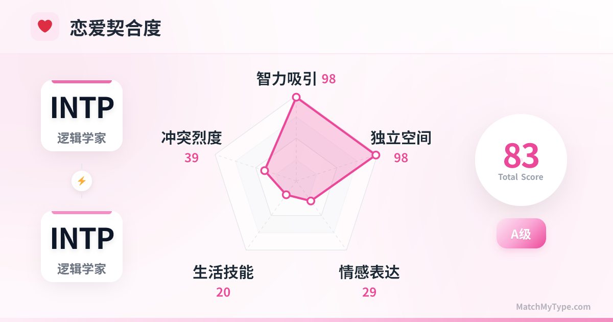这是一种“照镜子”般的惊喜。INTP 习惯了被周围人视为“怪胎”、“杠精”或“冷漠的人”,但遇到另一个 INTP 时,那种孤独感瞬间消散。你们能听懂彼此最冷门的笑话,能跟上对方跳跃性极强的逻辑闭环。这种智力上的势均力敌(Sapiosexuality)是极其性感的,你们会被对方大脑的性感程度深深迷住,仿佛找到了世界上唯一能解开自己代码的黑客。