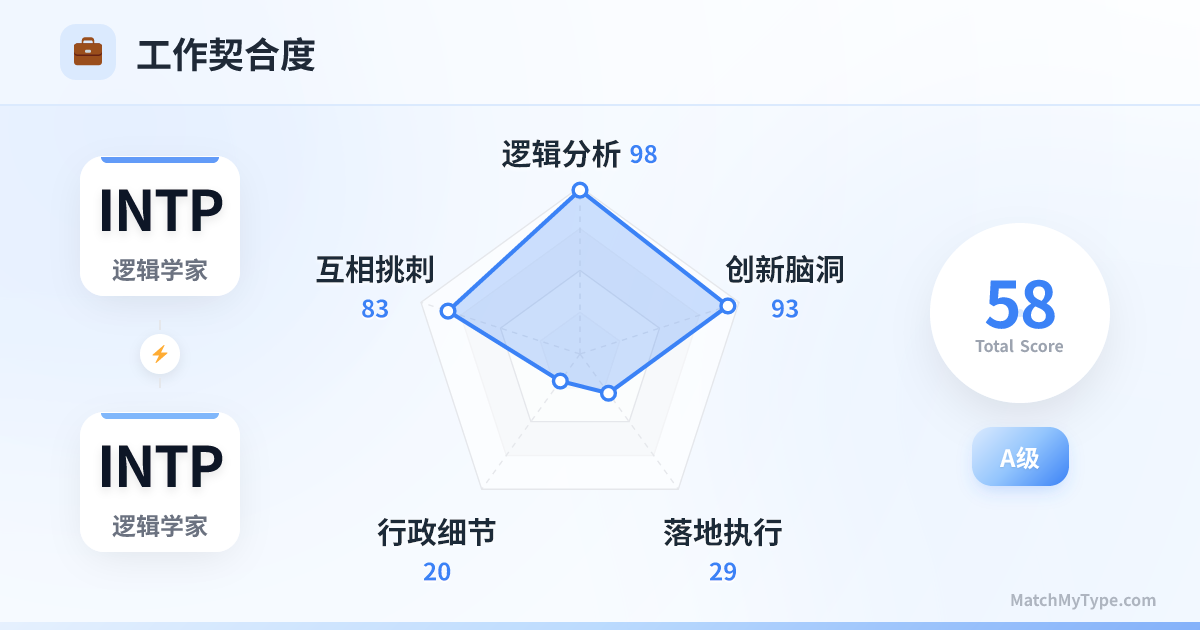 放羊式管理。INTP 老板根本不在乎你几点打卡,只看结果。这让 INTP 员工感到极度自由和舒适。但缺点是,老板可能给不出明确的指令,全靠员工自己悟,或者老板自己经常变卦(Ne爆发)。