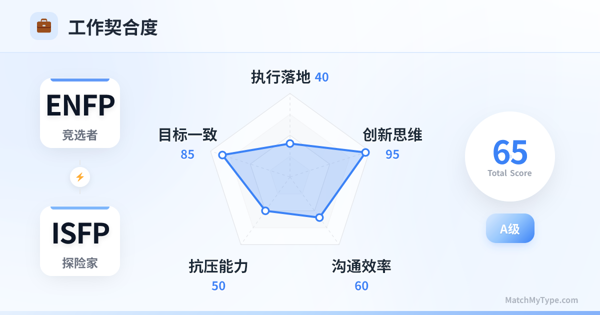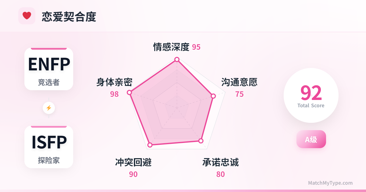 - 1**回避型冲突**:两人都讨厌冲突(Fi),遇到问题倾向于逃避或冷处理。ENFP 可能会用玩笑掩盖不满,ISFP 则会直接沉默。问题积压久了会爆发。