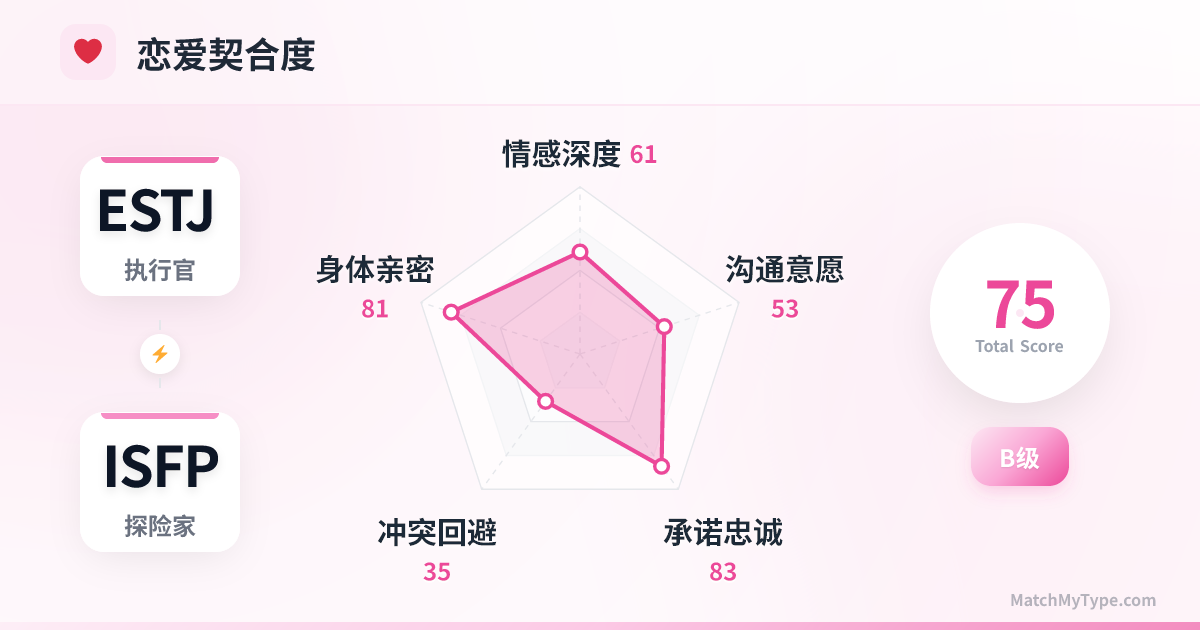 这是一对典型的「现实主义互补」组合。ESTJ 沉稳可靠,像一座大山;ISFP 温柔灵动,像山间的溪流。ESTJ 常常被 ISFP 独特的审美和随性的魅力吸引,而 ISFP 则会在 ESTJ 强大的气场和解决问题的能力中找到安全感。但这也是一对需要在「控制」与「自由」之间不断走钢丝的组合。