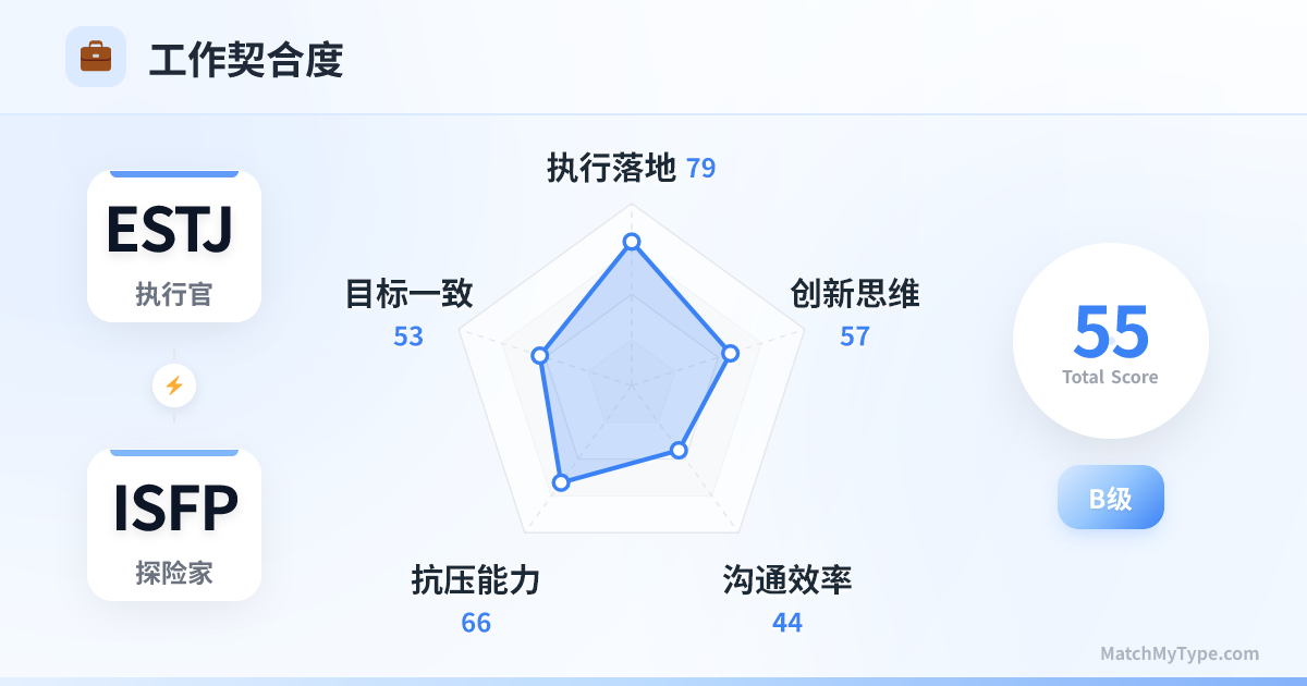 典型的严师出高徒,但也可能是噩梦。ESTJ 老板看重考勤、日报和KPI。ISFP 员工如果迟到、情绪化,会被 ESTJ 严厉批评。建议 ESTJ 给 ISFP 留出“创作特区”,只看最终交付结果,不要盯着过程中的细枝末节。