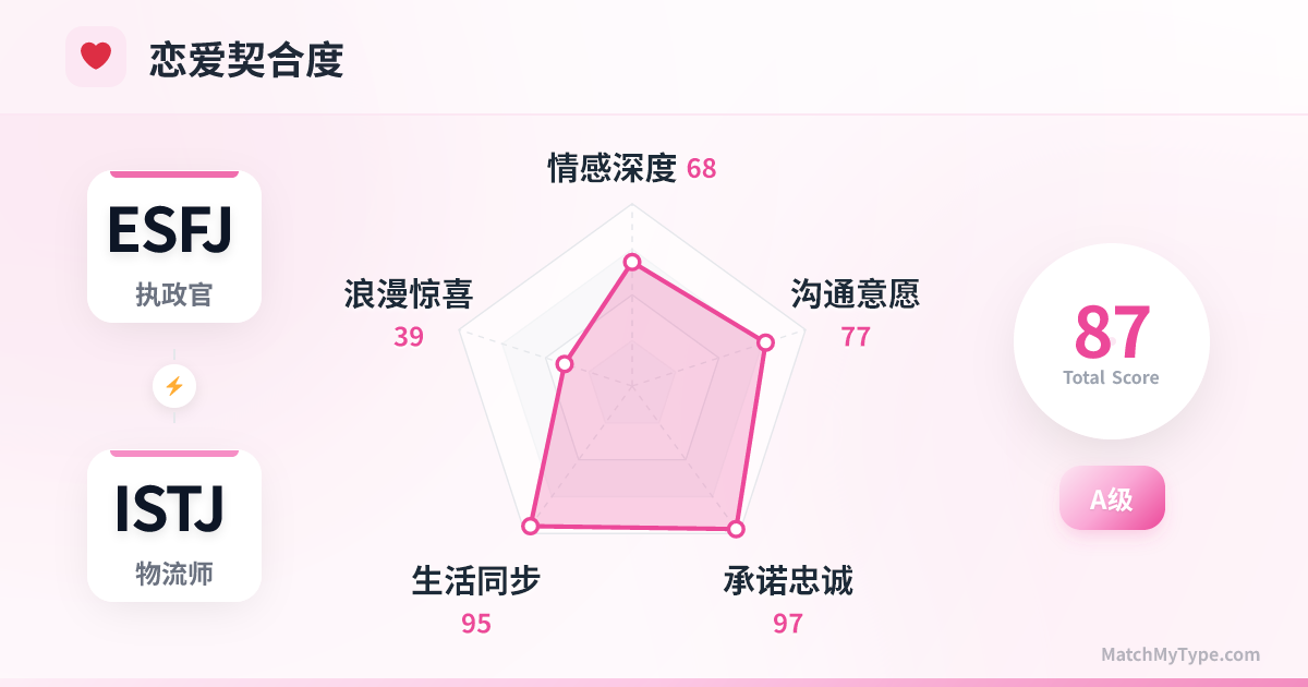双方都庆幸找到了一个“正常人”。约会准时,承诺兑现,没有抓马。ESFJ 享受照顾 ISTJ,ISTJ 享受被安排得妥妥当当。
