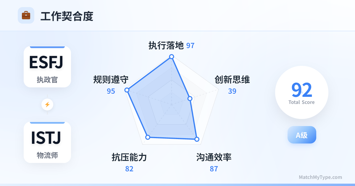 这是职场上最让人放心的“落地组合”。如果说 ENFP 和 ENTP 负责画饼,那 ESFJ 和 ISTJ 就是负责把饼做出来的人。你们是公司的基石,是流程的守护者,是执行力的代名词。