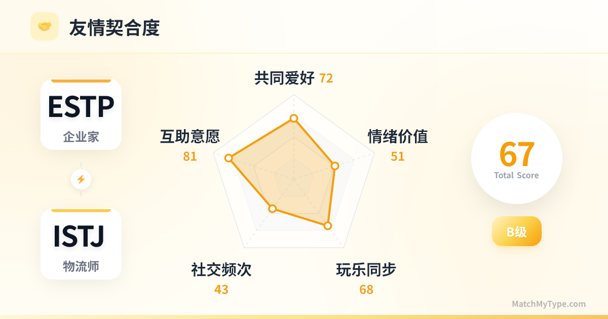 这是职场中效率最高的“野蛮生长 x 规范管理”组合。如果你们合伙开公司,成功率极高。ESTP 负责把猎物打回来,ISTJ 负责把肉腌好、存好、分配好。