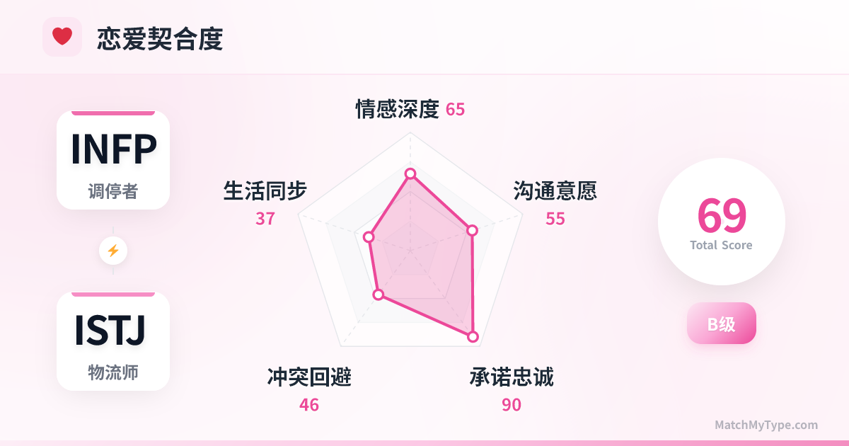 这是一对典型的“差异吸引”组合。INFP 被 ISTJ 的稳重、可靠和那种“说到做到”的安全感所吸引;ISTJ 则会被 INFP 的纯真、想象力和看似柔弱却坚韧的内核所打动。然而,当浪漫褪去,生活习惯和思维方式的巨大差异将是最大的考验。