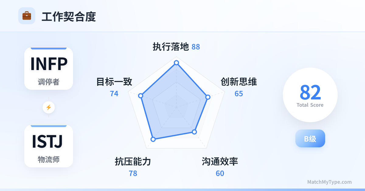 在工作中,这是一对极具潜力的“建筑师与工程师”组合。INFP 负责描绘蓝图和愿景,ISTJ 负责打地基和砌砖。只要分工明确,你们能把最疯狂的创意变成最扎实的产品。