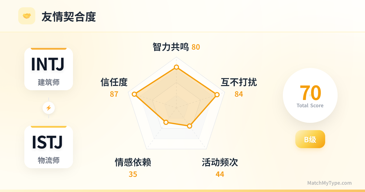 吸引力源于“胜任感”和“可靠性”。INTJ 欣赏 ISTJ 井井有条、说到做到的靠谱特质,这让 INTJ 感到省心;ISTJ 钦佩 INTJ 的远见卓识和解决复杂问题的能力,这让 ISTJ 感到安心。两人都厌恶情绪化和戏剧化,初次接触时,那种“我就喜欢你这种有话直说、不废话”的氛围会让两人迅速建立起智力上的尊重。