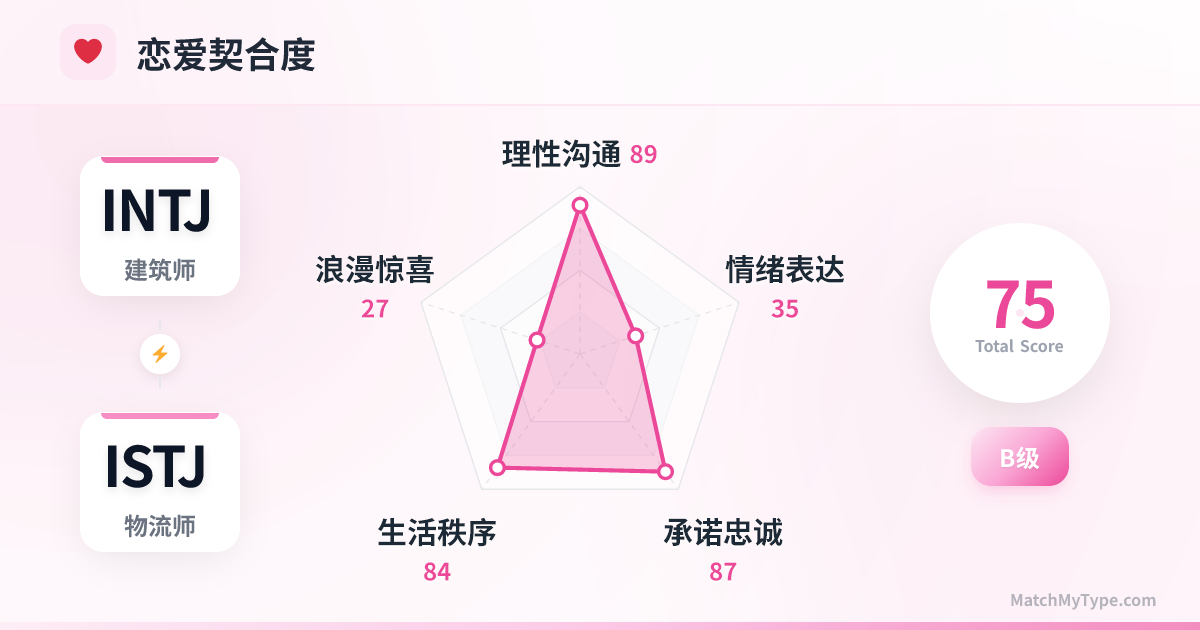 这是一段没有狗血剧情、没有猜忌试探的“极简主义”恋情。INTJ 和 ISTJ 的结合就像两台超级计算机联网,彼此都能读懂对方的代码。虽然外人看来可能缺乏激情,但你们内部的稳定性和默契度是其他组合无法比拟的。