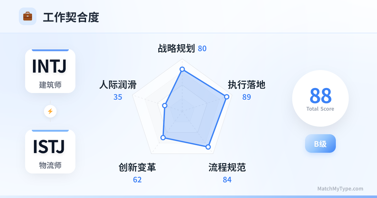 战略与执行的完美闭环。INTJ 擅长从混乱中看出模式,制定长远战略;ISTJ 擅长建立流程,确保每一个细节都准确无误。INTJ 提出的创新方案,ISTJ 能迅速找出落地风险并制定SOP。Te 功能的共振让沟通成本极低,甚至不需要说完一句话,对方就懂了。