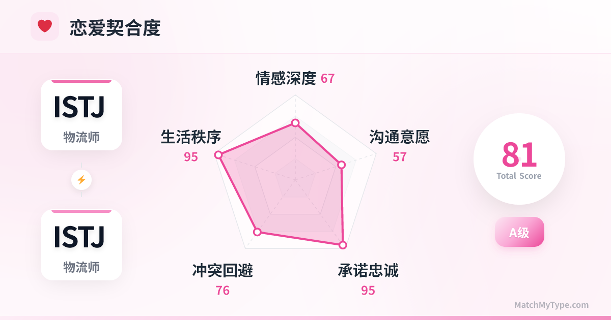 关系进入自动驾驶模式。你们是彼此最忠诚的战友和合伙人。虽然缺乏惊喜,但这种“我知道你会永远在那里”的确定性,是 ISTJ 毕生追求的终极幸福。