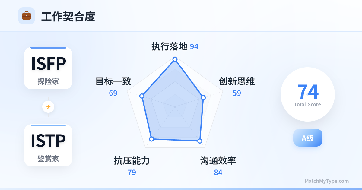 默契的特种兵搭档。你们适合分工明确的任务:ISFP 负责前端界面、用户体验、软装搭配;ISTP 负责后端代码、结构搭建、硬件维护。只要互不干涉专业领域,你们就是效率最高的组合。