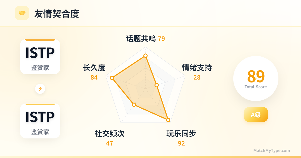 因为类型完全相同,很难实现“互补式学习”,更多是“镜像式反思”。 **共同进化**:看着对方在压力下如何冷静拆解问题,能强化自己的自信。看着对方因为过于直男/直女而得罪人,能像照镜子一样反思自己的社交缺陷。 **需要引入外援**:你们很难从对方身上学到“长远规划”或“情绪管理”。建议在团队中拉入一个 NJ 型(规划)或 FJ 型(协调)的伙伴,否则你们的小团体会变成一个与世隔绝的技术孤岛。